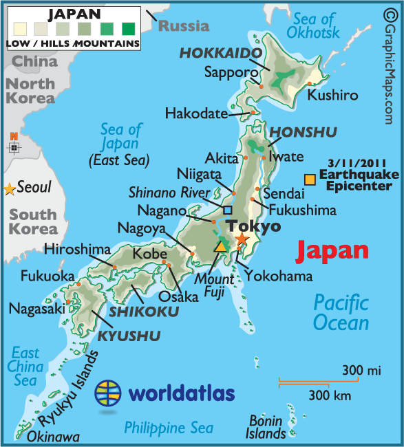 I hope this map helps everyone to better understand where we are in relation to the Earthquake Epicenter (Orange square) and all of the Tsunami damage. We are located in the bottom left corner of this map. The large island at the very bottom is Okinawa. We are about 1,130 miles from Tokyo. That is why we didn't feel the earthquake or get the major part of the tsunami waves.
